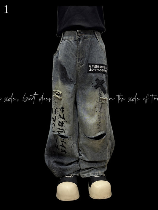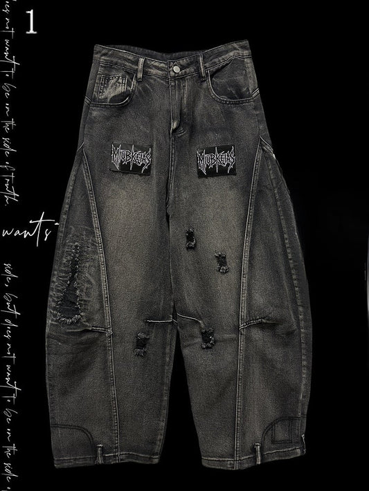 Letter Jeans Holes Details Cut Dark Distressed Gray Applique Wide-leg