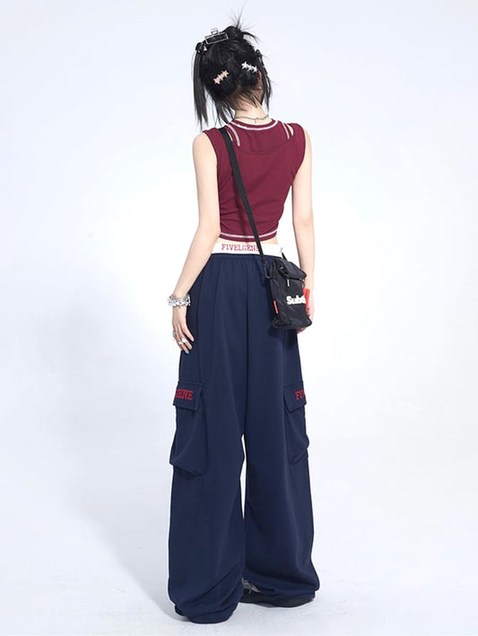 Decorated Cut Jeans Cargo Y2K Letter Pockets Blue Wide-leg Applique