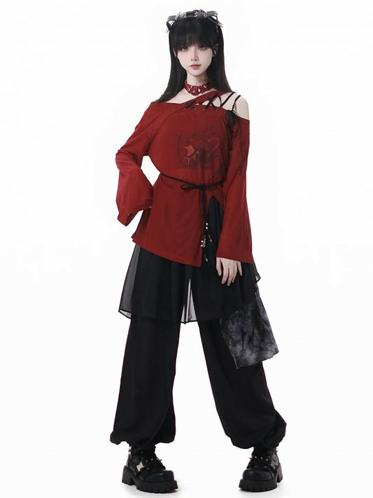 Wide Leg Punk Crosses Distressed Black Holes Plaid Jeans Red