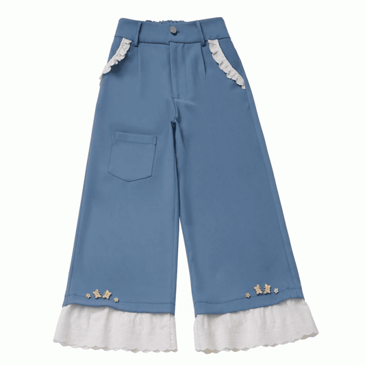 Blue Butterfly Buttons Lace Trim Cottagecore Wide-Leg Pants