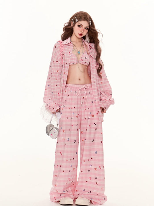 Pink Star Pattern Drawstring Waist Wide-Leg Plaid Pants