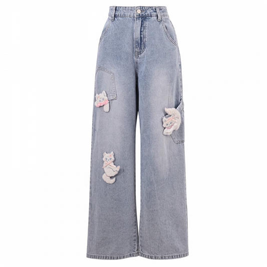 with Detachable Kitty Appliques Blue Wide-Leg Jeans Short/Long Version