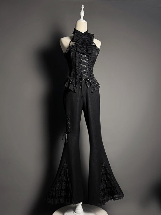Tiered Patches Pants Lace Flared Cuffs Black