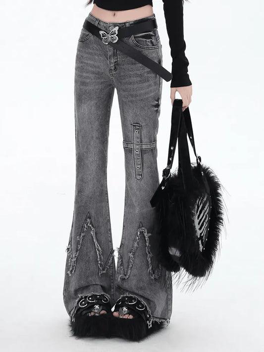 Silhouette Jeans With Multiple Pocket Accents Waist Flare Kawaii Black Glamorous Bittersweet Low
