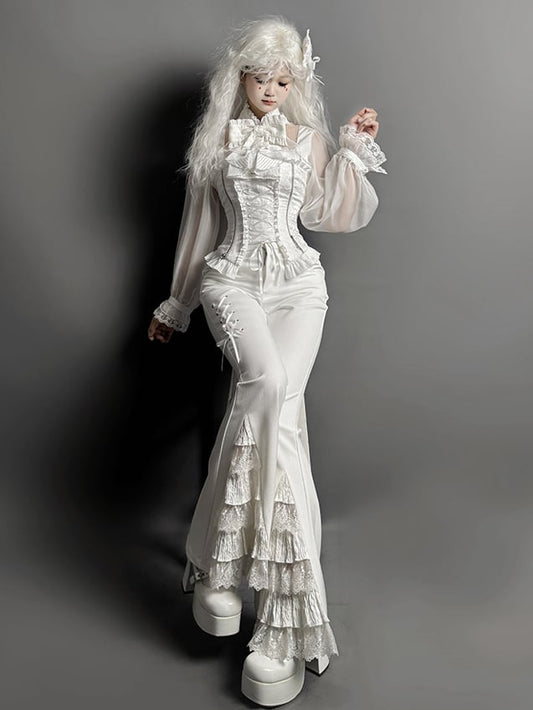 Lace Patches Flared Cuffs Pants White Tiered