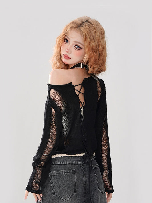 Colerful Hollow-Out Knit Top with Distress Trim One-Shoulder