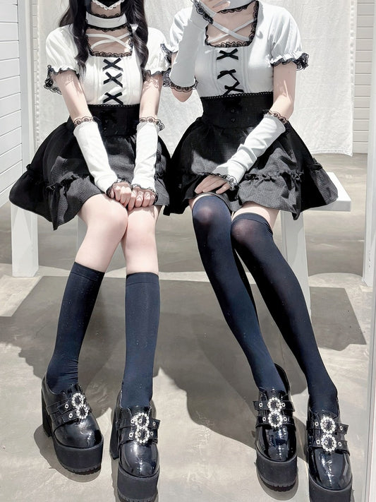 Crisscross Black Lace-ups Letter with Halter Top White Red Crop Print