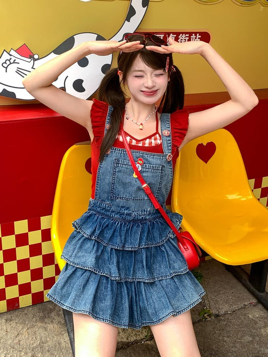 Red Halter Neck Flutter Sleeves Cherry Embroidery Neckline Faux Two-pieces Tank Top