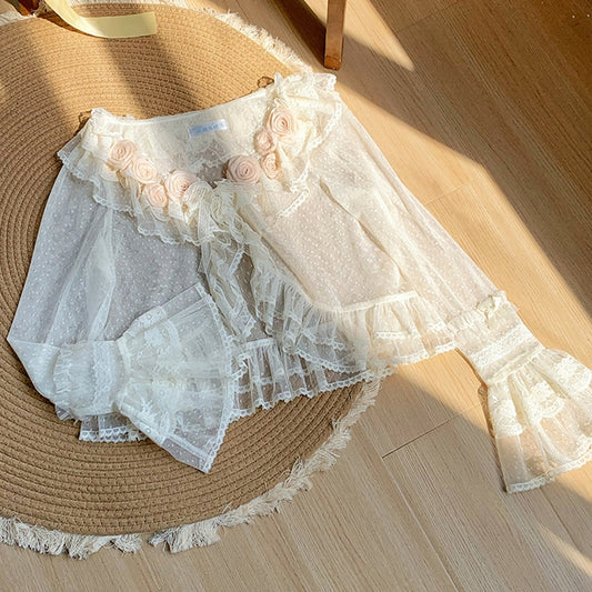 Dotted Sheer Trimming Long Tulle Flounce Sleeves White Top