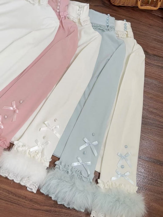 Turtleneck Trim Lace Top White Blue with Fur Accents