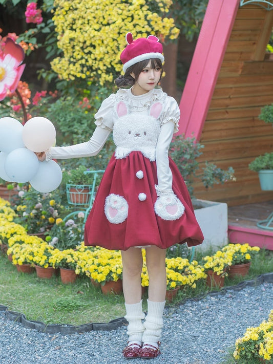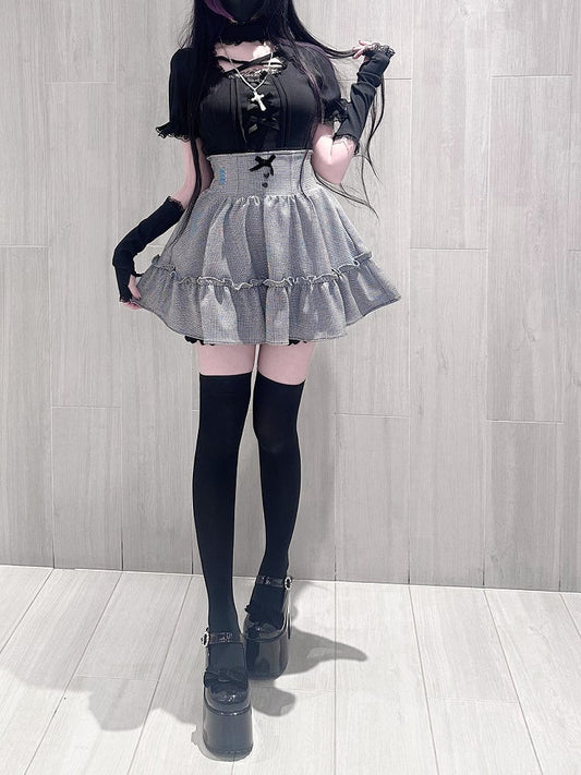 Off-the-shoulder Choker Bowknot+ Design Bunny Waist Plaid Idol High Neckline Skirt+ Set- Ears + Top Jirai Kei Black