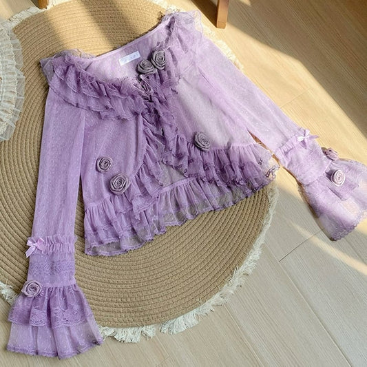 Top Sleeves Long Sheer Tulle Purple Trimming Flounce Dotted