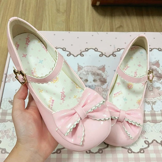Round Design Bow Pink Pattern Playful Low-heel Bear Mary Sweet with Dot Janes and Lolita Toe Top - Closure