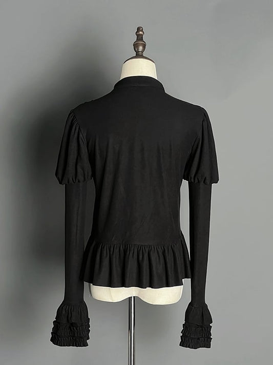 Accents with Brooch Blouse Short Jirai Black Bow Sleeve and Lace Kei Top