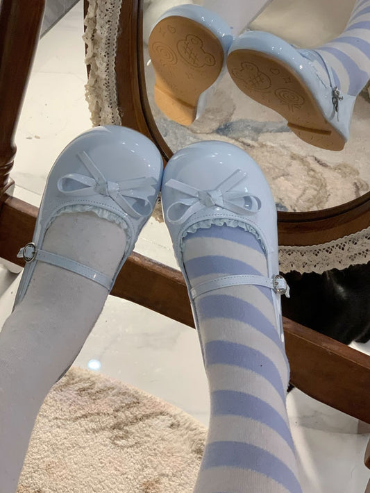 Trim Flats PU Bow Blue Baby at Lace Knotted Leather Sweet Top