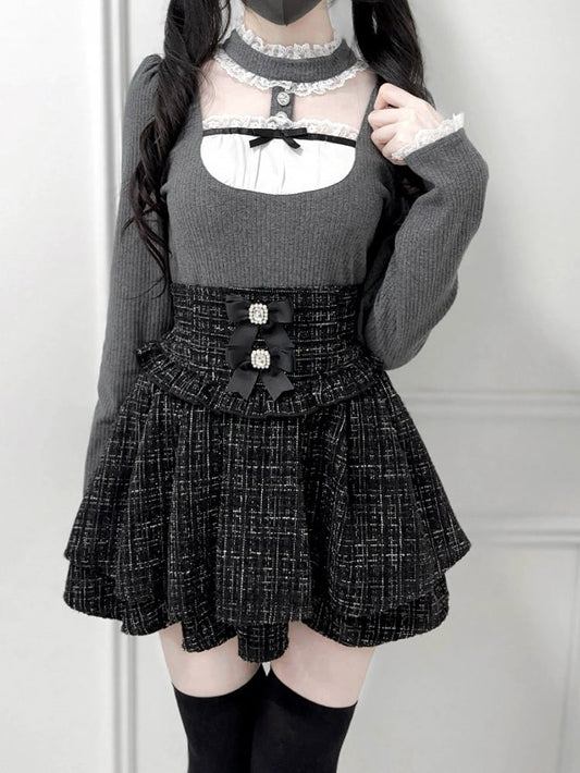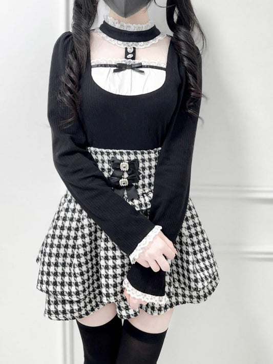 Kei Black/White with and Neckline Tweed Jirai Bow Criss-Cross Top Knit Big