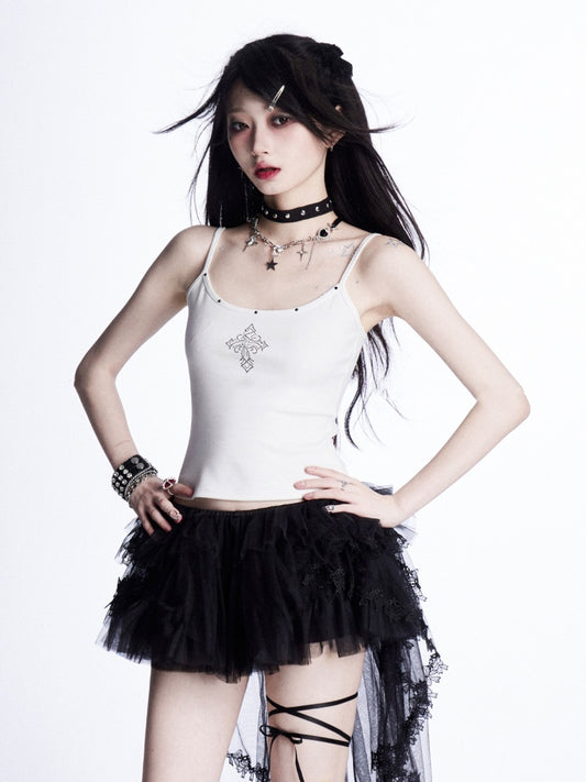 Cami Top White Rhinestones Embellished Cross Glamorous