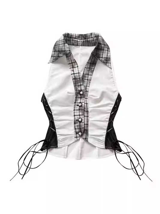 Shirt Black Plaid Collar Side Pattern Cropped Sleeveless Top with Lace-up Details