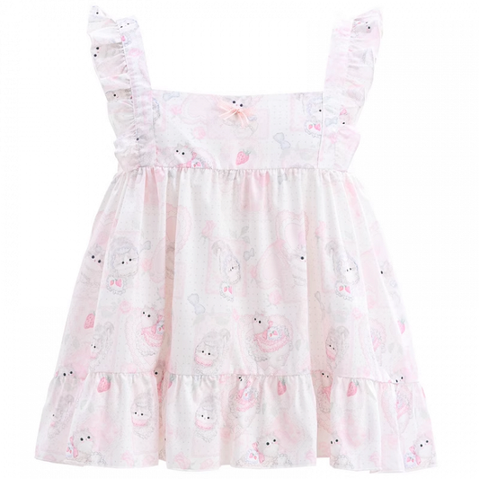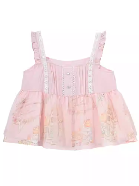 Flutter Sleeves Cartoon Bear Print Sleeveless Top Sweet Pink