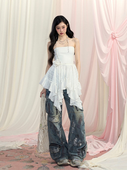 Trim Hem Ruffles Glamorous Asymmetrical White Top Cami