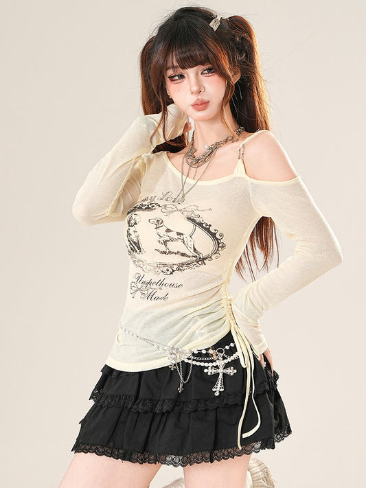 Long Sleeves Tulle Cascading Sheer Trim Top Beige Ruffle Dotted