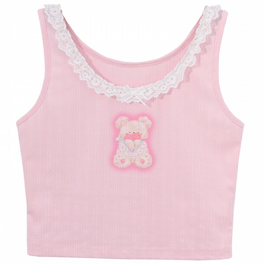 Neckline Pink Teddy Bear Print Lace Trim Sweet Tank Top