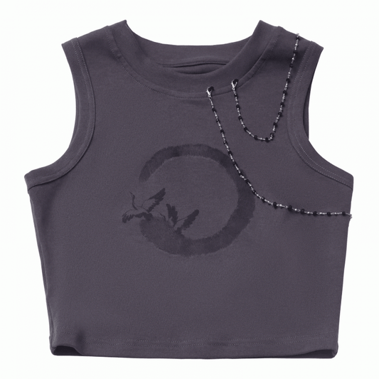 Dark Gray Crane Print Cropped Detachable Tank Top Chains with Beaded
