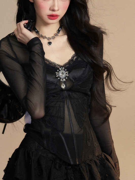Rhinestone Embellished Glamorous Top Black V-neck Butterfly Embroidery