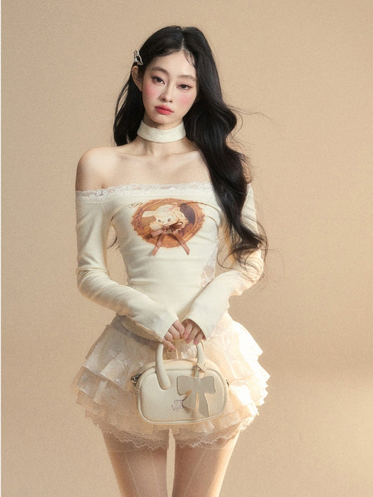 Lamb Print Waist Glamorous Top Patches Apricot Off-the-shoulder Lace Neckline