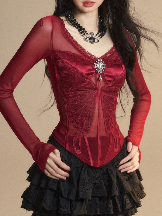 Red V-neck Top Rhinestone Embellished Glamorous Butterfly Embroidery