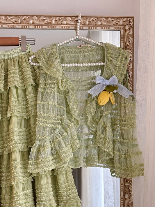 Open Placket Green Tulle Dotted Top