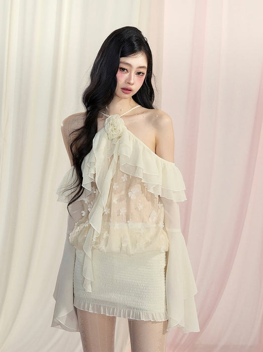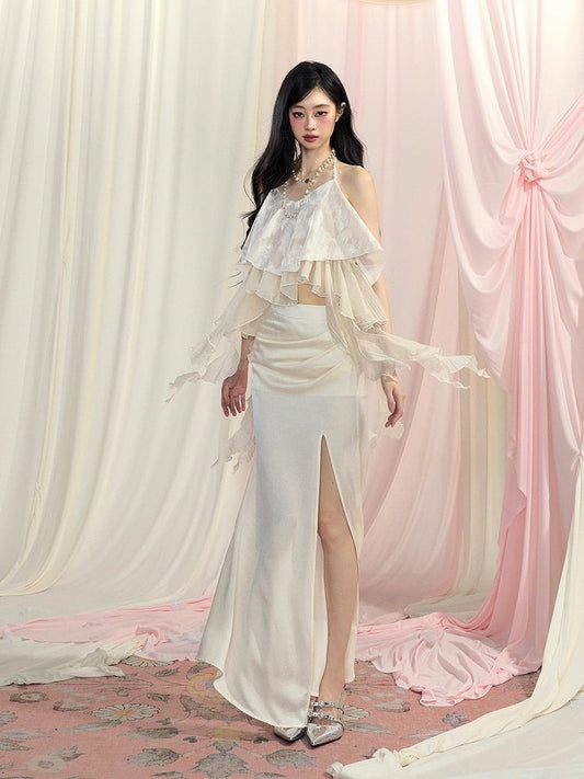 Top/Thigh-high Slit Skirt Apricot Asymmetrical Flounce Hem Halter Neck Chiffon