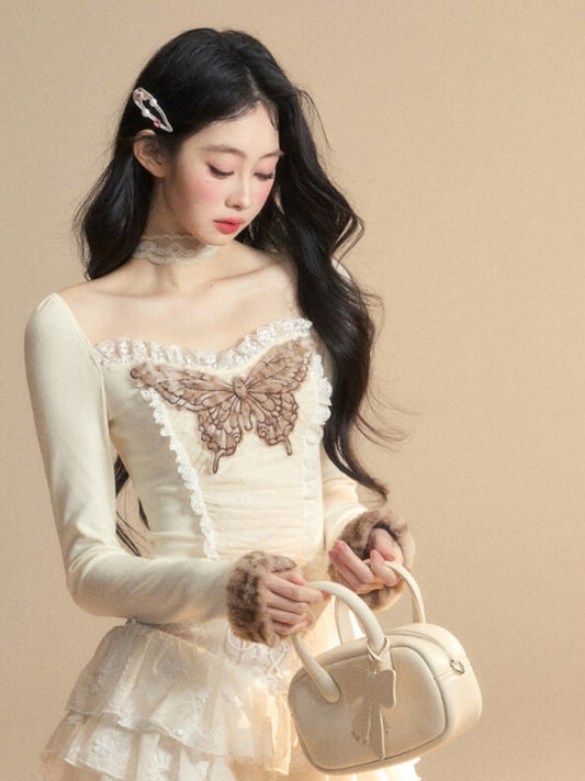 Apricot Lace Butterfly Embroidered Plush Cuff Glamorous Top Knitted Trim