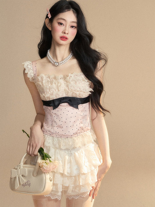 Glamorous Pink Polka-dot Pattern Sleeveless Top Ruffled Lace Trim Detail Bowknot