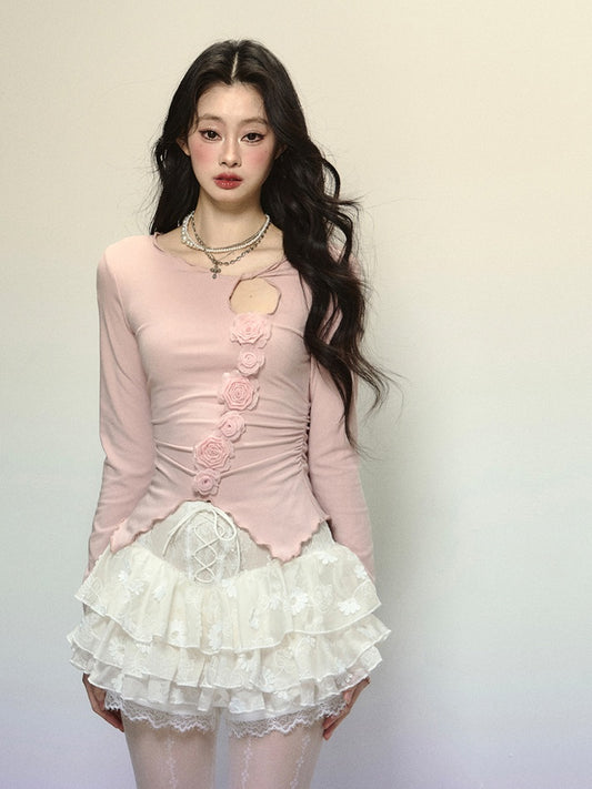 Knitted Detail Neck Floral Embellished Cutout Top Pink Round Glamorous