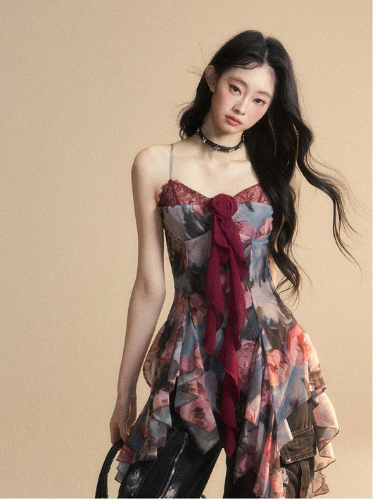 Painting Red Oil Cami Top Asymmetrical Flounce Embellished Hem Floral Glamorous