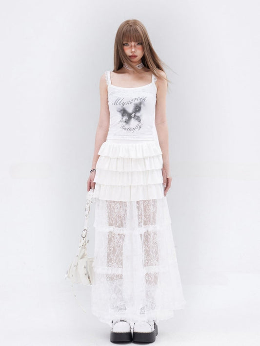 White Contrast Lace Patches Glamorous Cami Top Tiered Ruffles