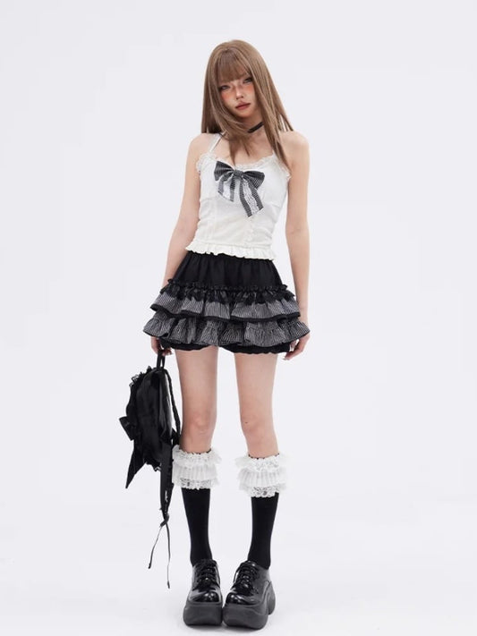 Hem Tiered Trim Cardigan Cami Glamorous Ruffle White +Big Ruffled Skirt Bow Full Set-Black Top+Black