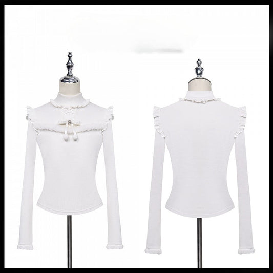 Jirai Kei Plush Trim Cutout Detail Bow Rhinestone Embellished White Top