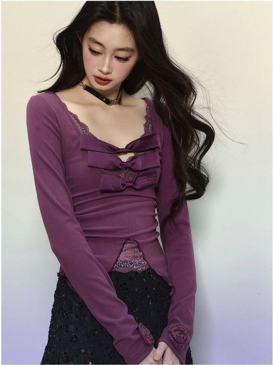 Purple V-neck Top Knitted Detail Contrast Lace Patches Glamorous Bowknots