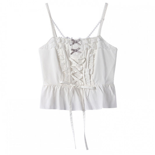 at White Ruffled Lace Trim Cami Top Details Lace-up Front with Bowknot Detail