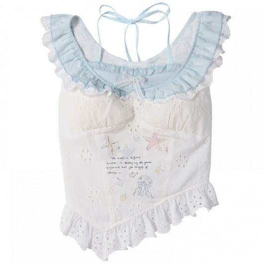 Curved Sleeves White Hem Sleeveless Top Starfish and Jellyfish Graffiti Flutter