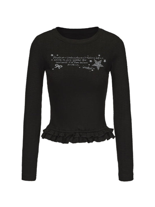 Black Round Neck Tiered Ruffle Trim Slim-fitting Printed Top
