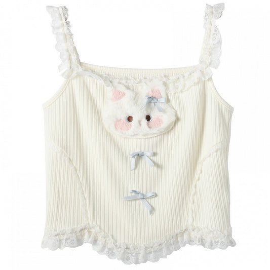 Bowknot Details Cami Top Plush Kitty Applique Ruffled Lace Trim White