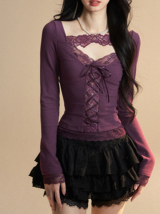 Glamorous Top with Lace-up Purple V-Neck Contrast Lace Patches Detail Front at