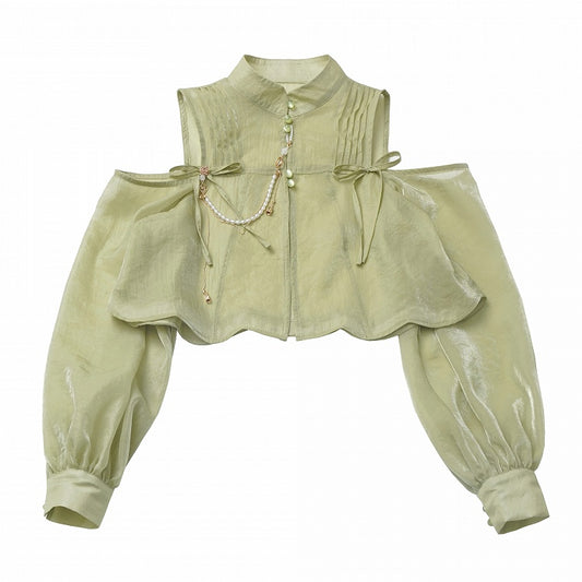 Cheongsam Style Green Semi-sheer Cutout Shoulder Ruched Design Neckline Top