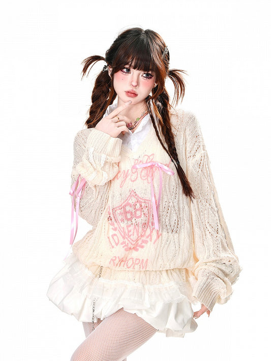 Top Distressed White/Brown/Black Letter Print Holes Summer Sun Protection Hollow-out