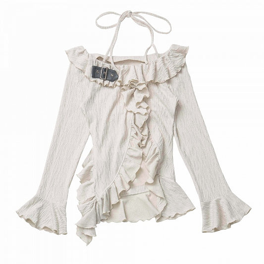Beige/Dark Gray Halter Neck Bell Sleeves Asymmetrical Ruffled Hem Knitted Top