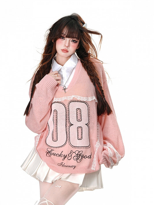 White Letters Embroidery V-neck Semi-sheer Lace Top