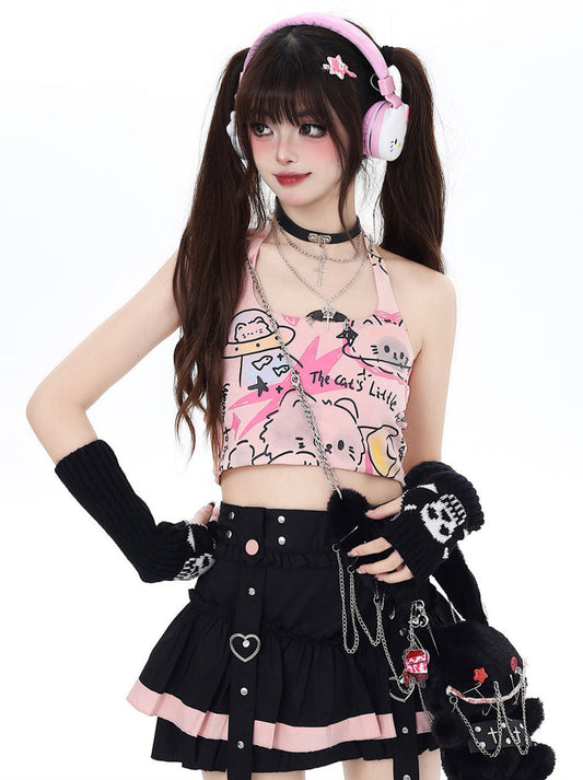 Pure Cute Print Halter Neck Top Graffiti Cat